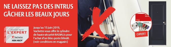 Jusqu’au 15 juin 2019, THP MULTI votre serrurier agréé l'Expert Vachette à WITTELSHEIM vous offre le cylindre de haute sécurité RADIALis pour l’achat d’un bloc-porte blindé Vachette.